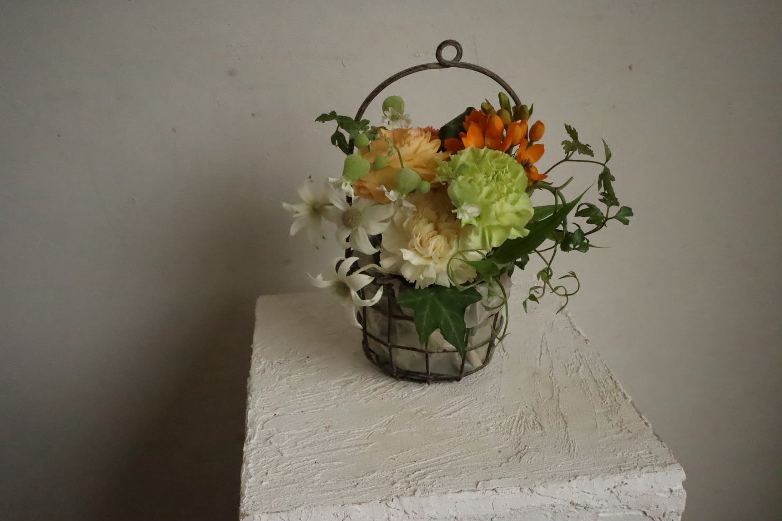 季節のお花をたっぷりとワイヤーバスケットに入った生花のアレンジメントです。お花の内容は完全おまかせでカーネーション入りで季節のお花を使用します。